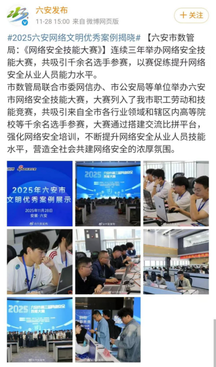 市数管局“网络安全技能大赛”案例入选2025年六安市网络文明优秀案例