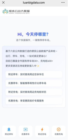 市大数据公司紧抓安徽省国家数据要素综合试验区建设契机,深耕数据资源开发利用,扎实推进数据归集、治理与场景落地,联合市水投公司(新能源停车公司)赴现场开展实地调研、详细摸排,最终接入30+停车场、660+充电桩,打造了“六安智停易充”数据产品。该产品以“公益便民、数据赋能”为核心,设置附近停车、优惠停车、附近充电、优惠充电等四大核心服务模块,市民可通过关注“绿水云山大数据”微信公众号或登录互联网网址(https://luanbigdata.com/life/)等方式免费、快速获取周边停车场、充电桩的精准信息,切实解决出行中的急难愁盼问题,让数据真正走进市民日常生活。